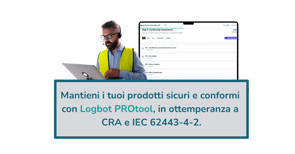 Logbot PROtool automatizza l’analisi dei rischi di prodotto, la gestione della documentazione tecnica e i controlli di conformità, rendendo la cybersecurity industriale semplice, tracciabile e verificabile in pochi click.